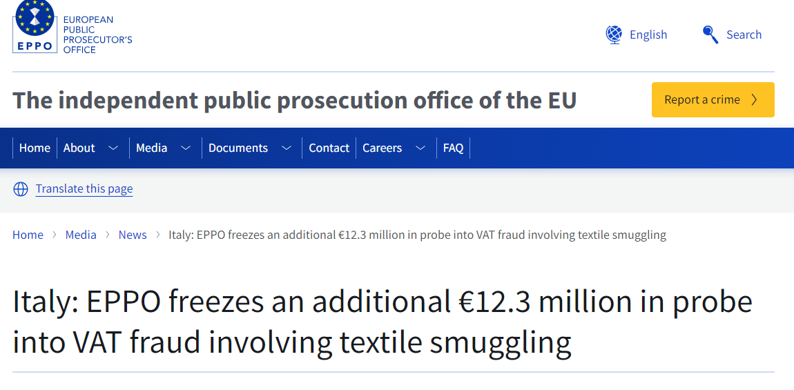 近日,应欧洲检察官办公室(EPPO)博洛尼亚办事处的要求,意大利法院批准了两项新的资产冻结令,总金额达1230万欧元,涉及中国非法进口纺织品的增值税欺诈嫌疑人。在执行新的冻结令过程中,意大利普拉托金融警察(Guardia di Finanza)查获了超过360万米的纺织品,估值约490万欧元。此外,警方在一名嫌疑人家中发现了13.36万欧元现金,并在其银行账户中冻结了超过12.8万欧元。