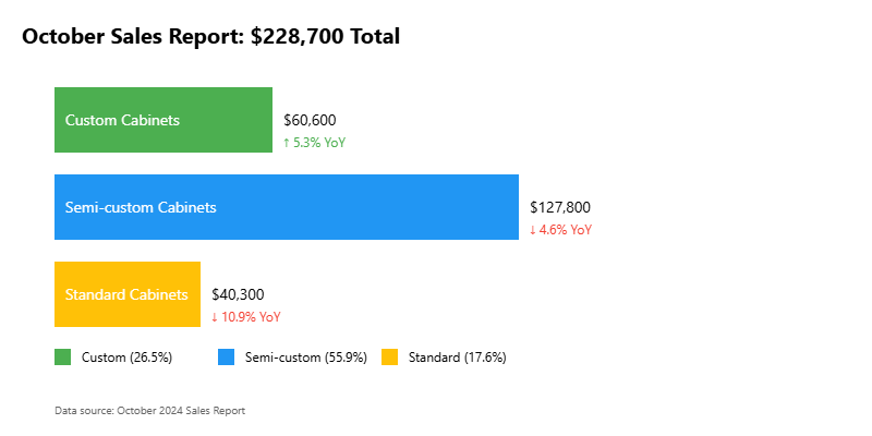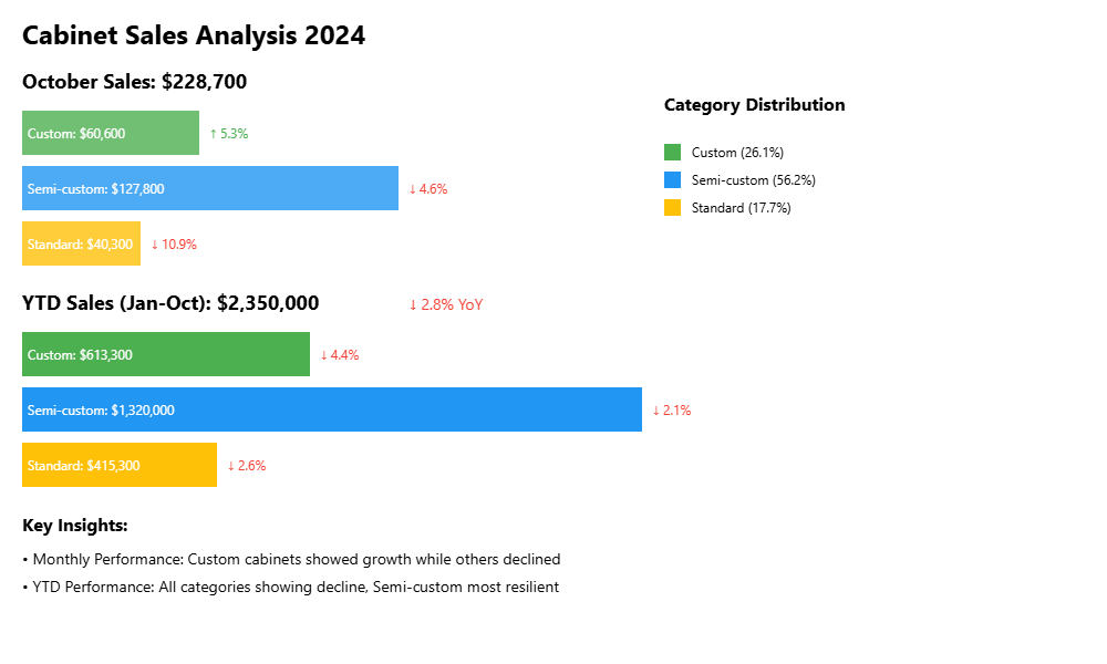 2024年前十个月累计销售情况:总销售额为235万美元,同比下降2.8%;定制橱柜销售额61.33万美元,同比下降4.4%;半定制橱柜销售额132万美元,同比下降2.1%;标准橱柜销售额41.53万美元,同比下降2.6%。