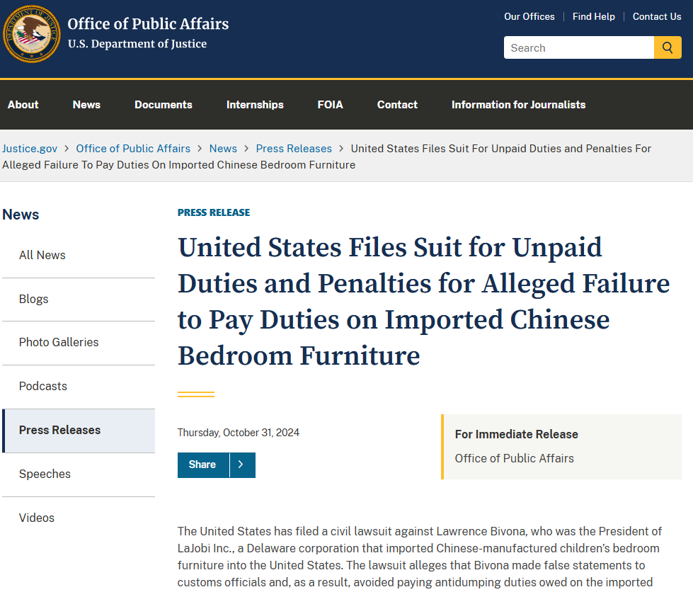 日前,据外媒报道,美国司法部对LaJobi公司前总裁Lawrence Bivona提起民事诉讼,指控其涉嫌逃避针对中国制儿童家具的反倾销税。要求其补缴700万美元的税款,并处以超过1500美元的民事罚款,共计2200万美元。