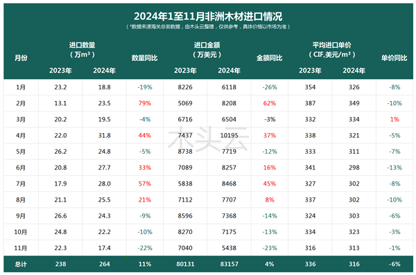 值得注意的是,2024年以来,非洲木材的进口单价一直维持在低于2023年同期的水平。尽管11月的进口平均单价降幅有所收窄,但仍比2023年同期下降了1%。