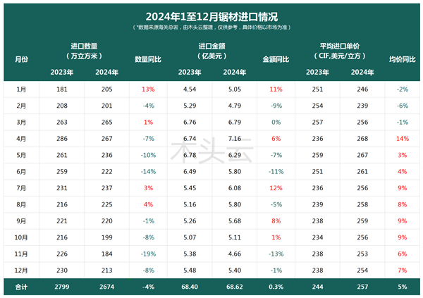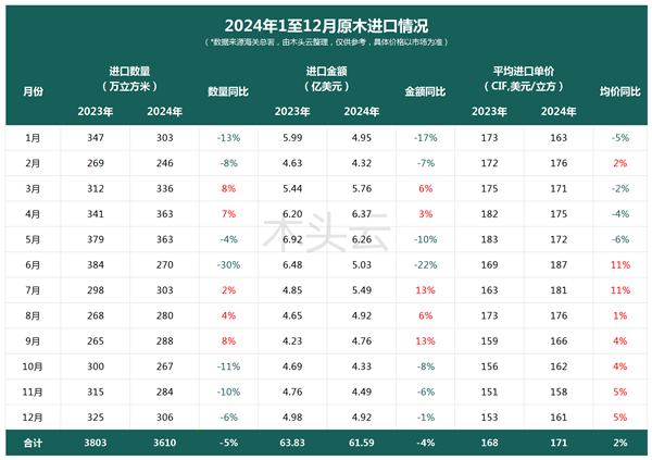 根据海关最新数据,2024年12月,全国木材累计进口519万立方米,对比2023年同期下降7%;环比11月增长11%。进口金额同比小幅下降1%,达到10.32亿美元;环比11月增长13%。12月木材平均进口单价增长6%。