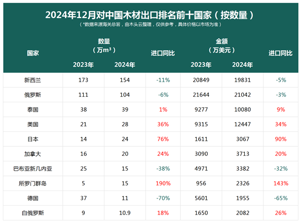 从前十大供应源来看,美国、日本以及所罗门群岛在12月对我国木材出口中呈现正向增长趋势。其中,对比2023年12月,所罗门群岛对中国木材出口同比增长近两倍。其余国家如新西兰出口同比下降11%至154万立方米;对比2024年11月,俄罗斯降幅缩减至6%,达到104万立方米;巴新与德国出口分别减少38%和70%。