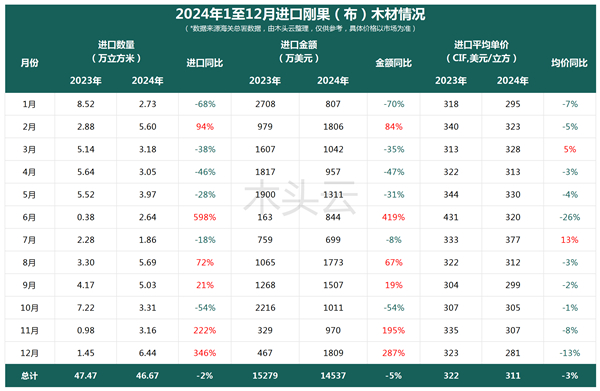 特别是在6月,出口至中国的刚果原木均价骤降了26%,这一变化直接推动了出口量的近6倍增长。而在12月,尽管出口均价同比下降了13%,但出口量却达到了全年的峰值,同比增长超过3倍,呈现出量增价跌的市场格局。