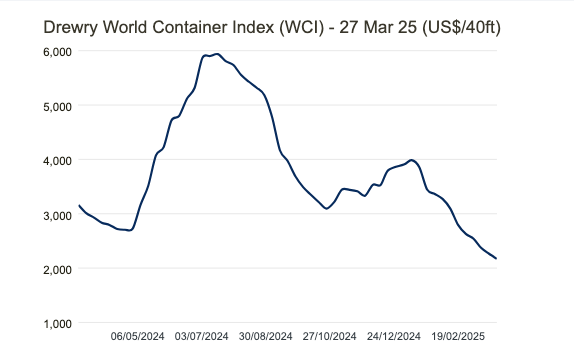 3月31日,供应链德鲁里(Drewry)报告显示,全球集装箱指数(WCI)下降4%至每40英尺集装箱2168美元。这一数字创下自2024年1月以来的最低水平,较2021年9月疫情高峰时期的10377美元大幅下降79%。然而,当前指数仍比2019年疫情前1420美元的平均水平高出53%。