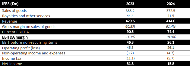 年度营收为4.14亿欧元,按当前汇率计算略有下降3.6%。良好的运营支出控制部分抵消了销售量下降的影响,息税前利润EBITDA为7440万欧元,符合此前公布的7200万至7600万欧元范围,合并息税前利润率为18%。