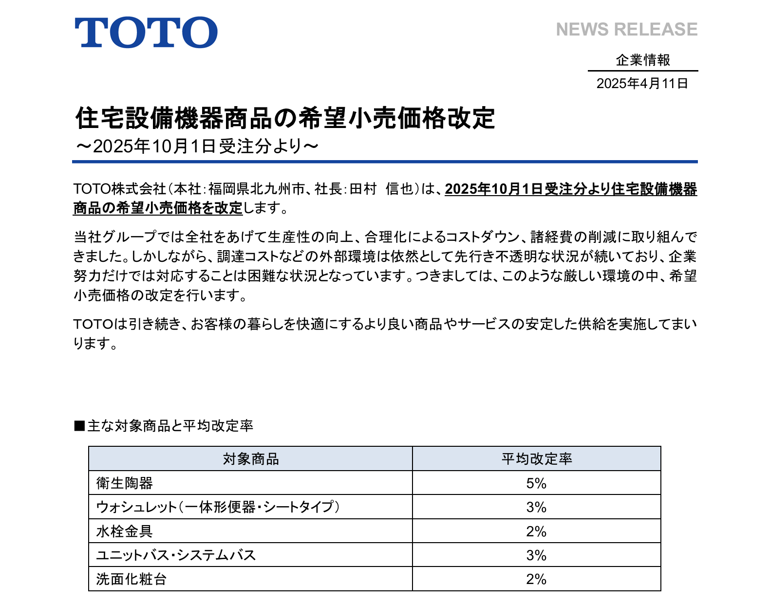 4月11日,TOTO宣布自2025年10月1日起上调部分商品的建议零售价。公告称,虽然公司已采取措施提高生产效率、削减经费,但采购成本等外部环境依然不明朗,目前仅靠公司自身努力已难以应对,因此决定涨价。