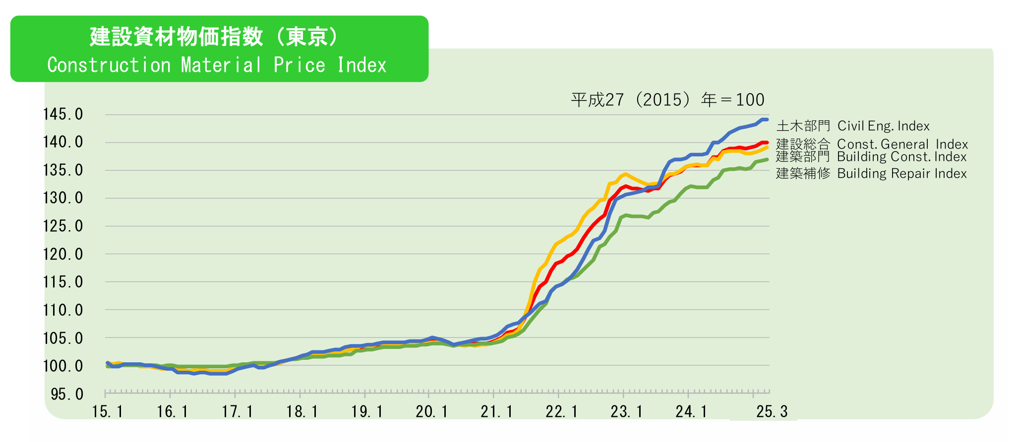 2024年以来,日本建材企业持续面对原材料成本高涨问题,而且数据显示相关情况还将持续。据日本建设物价调查会公开数据,2025年3月日本建材物价指数达到140.6点,环比增长0.2%,同比上升3.2%,已连续4个月上升,并创2015年以来新高。