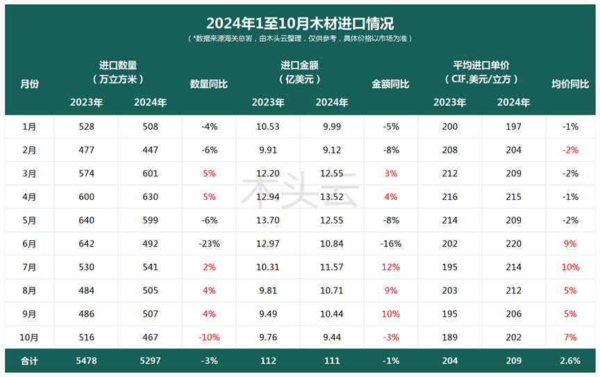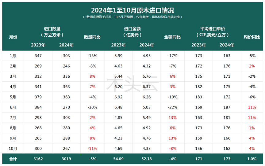 根据海关最新数据,2024年10月,全国木材累计到岸466万立方米,对比2023年同期下降10%;环比9月下降8%。进口金额同比下降3%,达到9.44亿美元;环比9月下降10%。10月木材平均进口单价增长7%。
