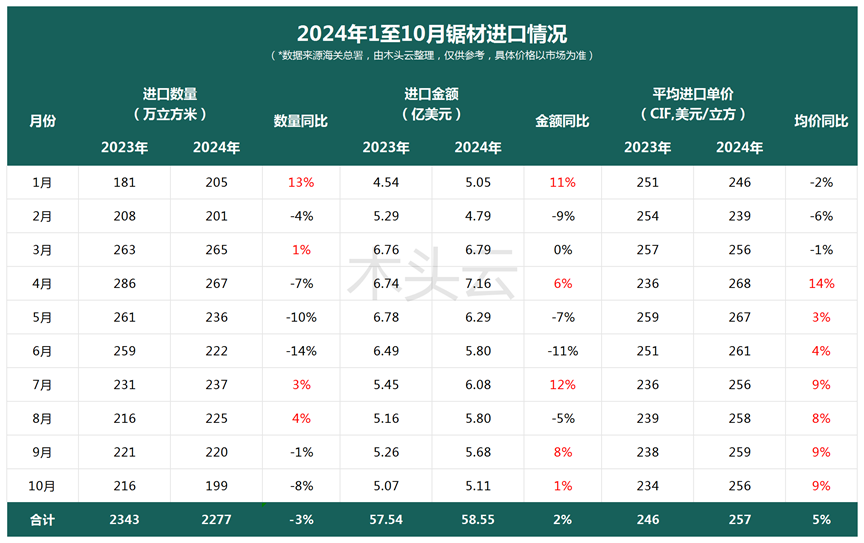 与此同时,锯材进口也同步呈现量跌价涨趋势。2024年10月全国累计进口锯材199万立方米,同比下降8%;进口金额同比增长1%,达到5.11亿美元。10月锯材平均进口单价上涨9%。
