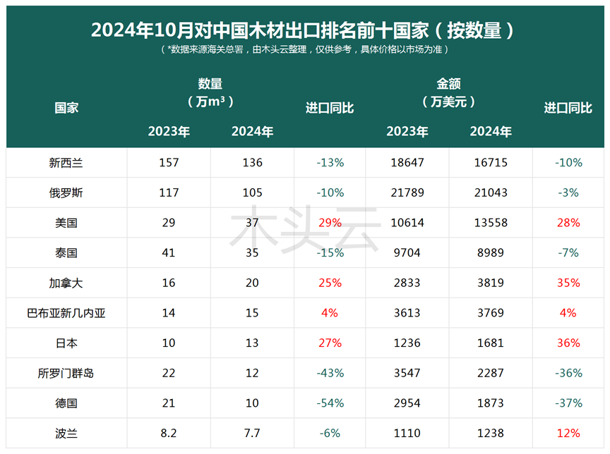 其余国家,与此同时,也有部分国家的木材出口对我国呈现出增长趋势。例如,美国(+29%至37万m³)、加拿大(+25%至20万m³)、巴新(+4%至15万m³)以及日本(+27%至13万m³)。