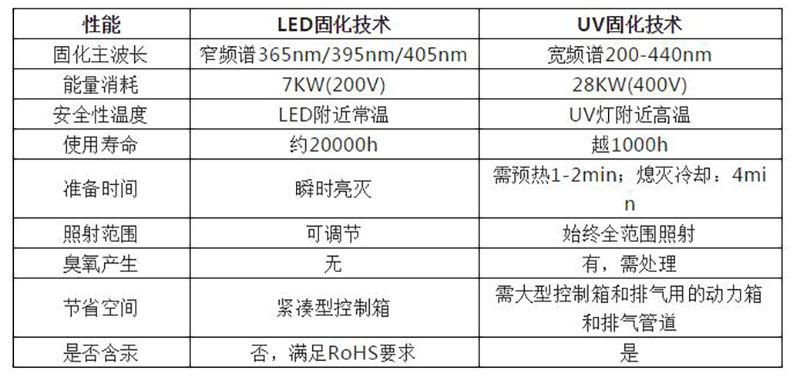 由于LED具有低电耗、寿命长、小型化、轻量化、瞬时响应、高输出性、不含汞、无臭氧等优点,被称为“解决环境问题的一张王牌”。作为一种节能环保的光源技术,LED产业已成为各国的国家战略,被广泛用于光固化行业。表1是 LED固化与UV固化的技术特点比较,可见,与传统UV系统相比,LED固化系统主要有以下优点:
