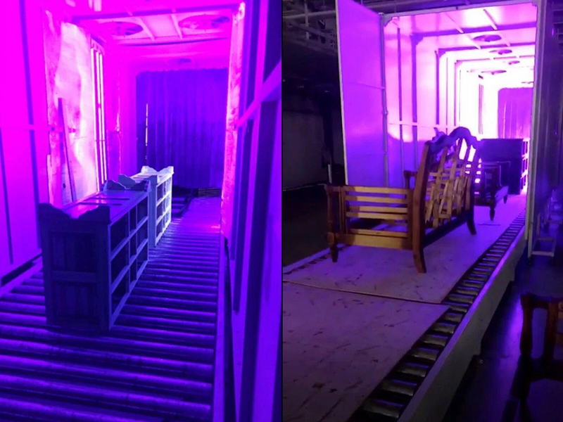 4.在喷涂技术方案上,如果厂家选择水性紫外光UV固化,则由于UV光源的自身特点,一方面仍然无法应对不规则曲面基材固化不足的难题,另一方面UV光源常常为中高压汞灯,工作时需要半小时以上预热且工作时短波长紫外光辐射不可避免地激发空气中氧气生成大量人体危害性臭氧(O3)物种,因此整个生产线不得不进行排风防护,造成“环保不节能”的尴尬结果,同时,更需要引起关注的是,UV光源启动电压很高,在家具厂的高湿度和高粉尘恶劣现实环境中,很容易造成电压击穿,在劳动密集型家具企业很容易引发群体性人身伤亡等重大安全事故。此外,UV光源普遍寿命低下,通常只有800小时左右使用寿命,因此大量含汞报废灯管的环境处理也是现实头疼的难题。上述种种原因解释了为什么水性UV涂料也始终无法在家具厂家实现技术落地。