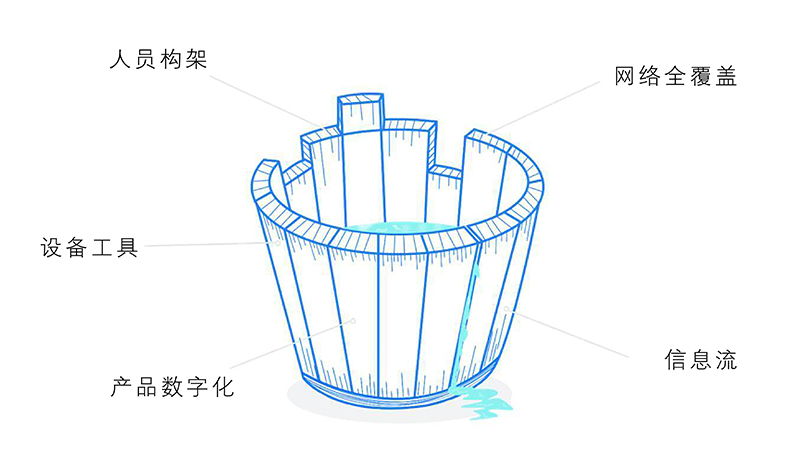 企业即木桶,利润是水。企业内部部门的构成,其实是组成了企业当中人员组织架构,加上设备工具组成企业的组织架构。第一,木桶定律告诉我们最短的短板,决定了木桶装水的多少。但是如果板子和板子之间是漏缝的,如前端的接单到交付到客户,此信息链的闭环需要很多部门的工作,他们之间的衔接有很多漏缝,也是不能装水的。第二,即使做到完美衔接,但每个板子的壁厚不一样,企业工作人员效率极低,则木桶的内径非常小,那么装水也是极少的。第三,要使企业的规模做大,做大了以后,木桶的内径也大,木桶才能多装水。木桶做大了,做好了,如果没有外面铁箍也不行。所以企业必须做到整体提升,而不单是解决设计、市场和设备等问题。