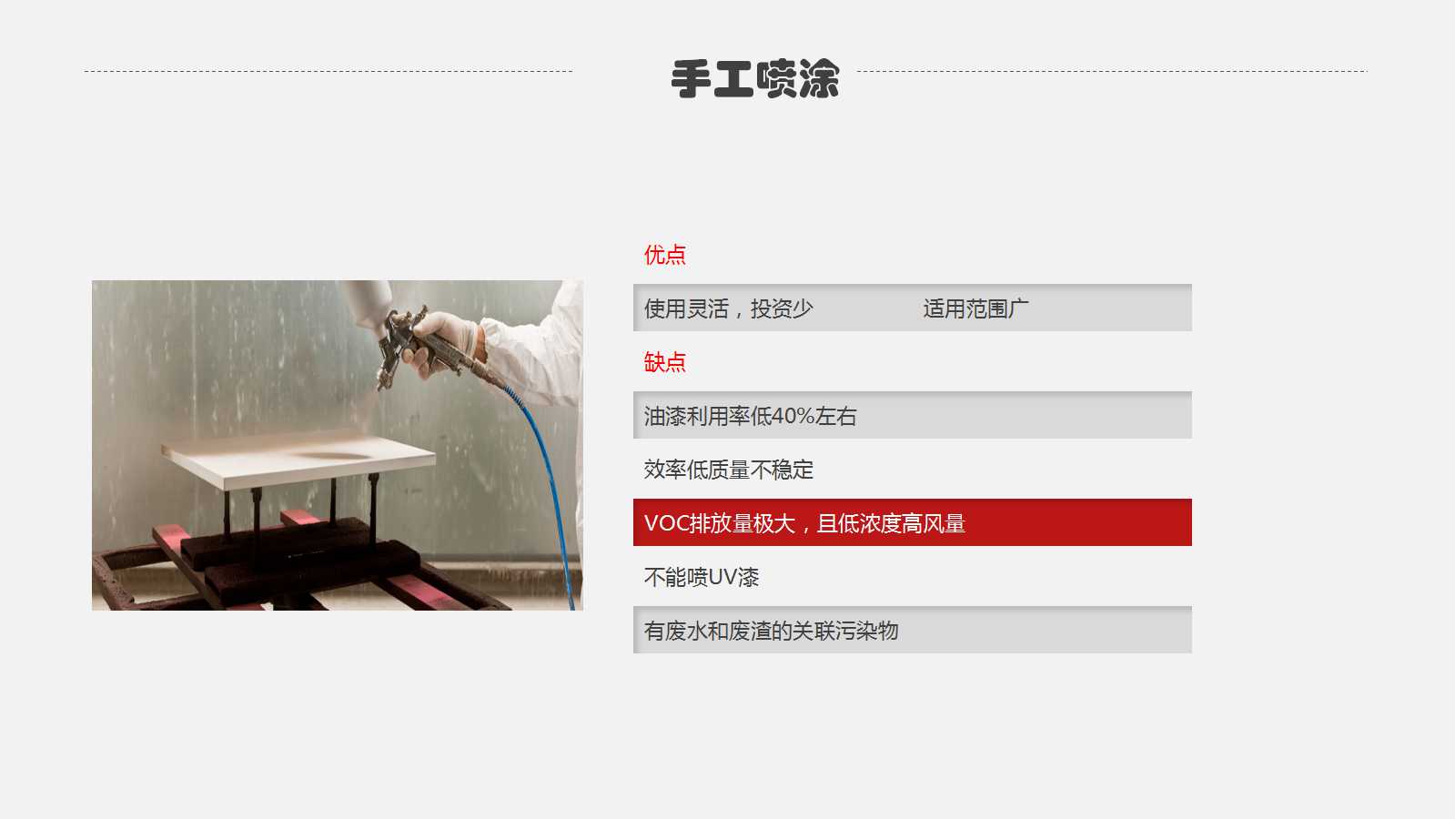 综合比较手工喷涂、辊涂和往复式喷涂的适用范围,手工喷涂可以适用任何产品,辊涂产品适用率占比为20%,往复式喷涂则可以试用60%的产品。油漆利用率上,手工喷涂的油漆利用率是30%-40%,辊涂的油漆利用率接近100%,往复式喷涂的油漆利用率接近80%。而VOC排放有非常大的差别,手工涂装VOC的排放量是往复式喷涂和辊涂的十倍到八倍。