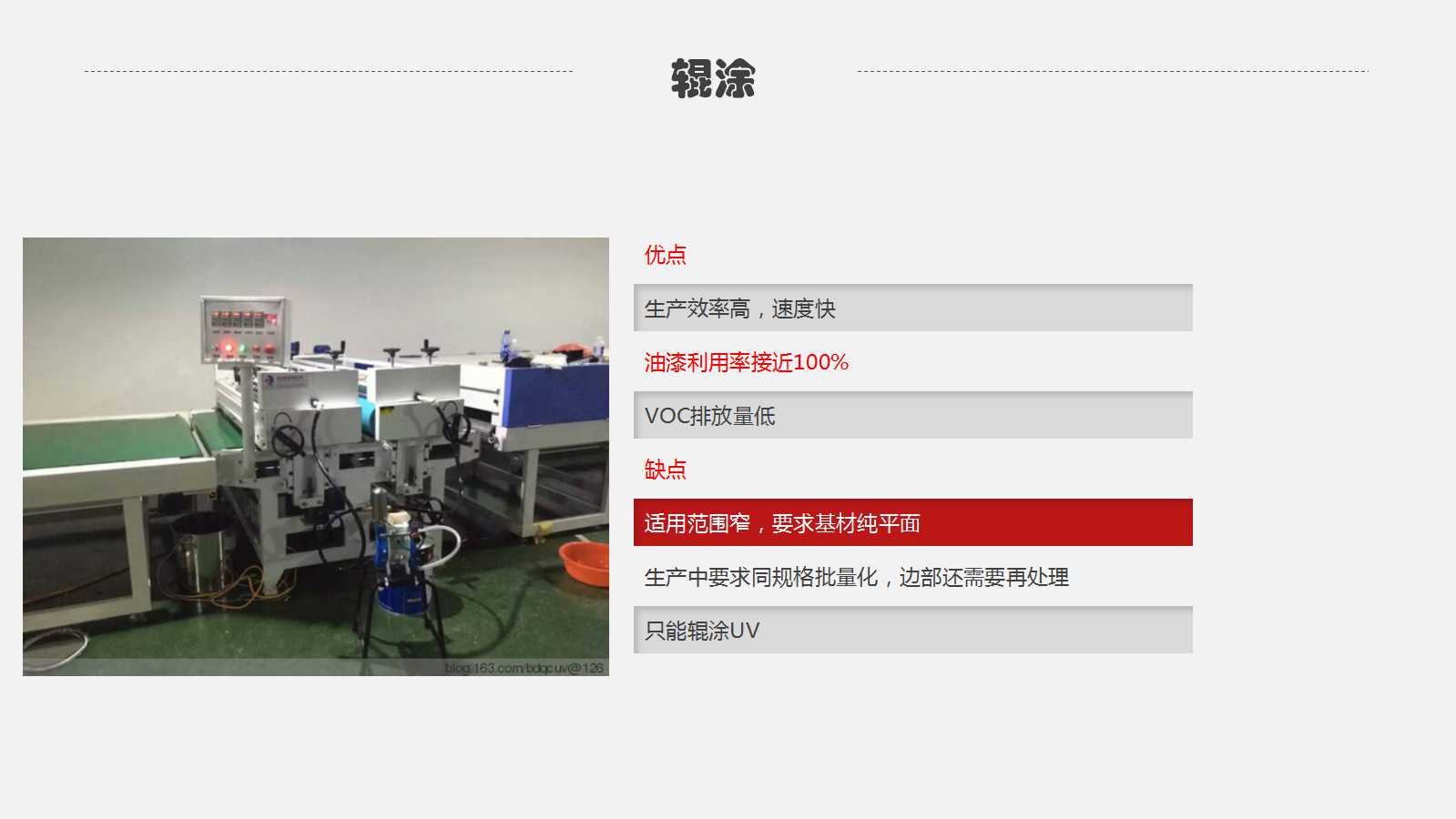 辊涂的优点是生产效率高,速度快,VOC排放低,油漆利用率接近100%,缺点是适用范围窄,要求基材纯平面,生产中要求同规格批量化,边部还需要再处理,且只能选择UV漆。