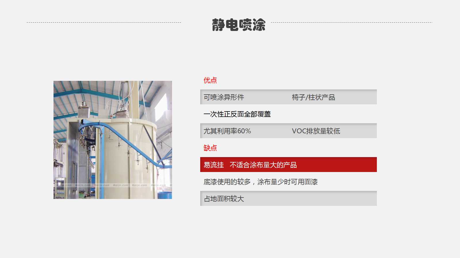 静电喷涂技术比较成熟,涂装异型适合像椅子和柱状的产品,可以一次性正方面覆盖,油漆的利用率60%以上,VOC的排放量相对环境集中。缺点是涂量不适合太大,因为是吊装式喷涂,易流挂,目前大量地应用在底漆上。