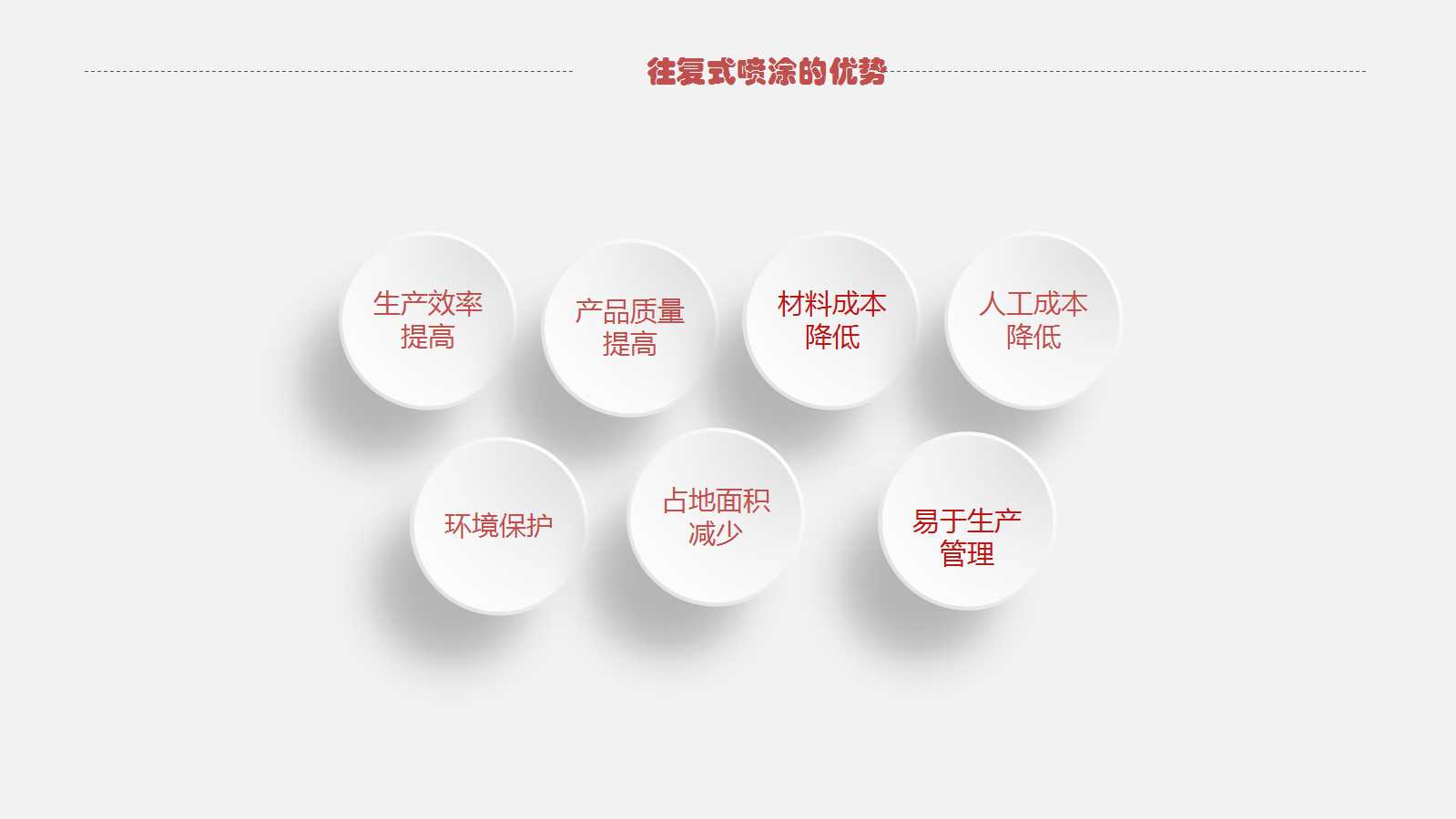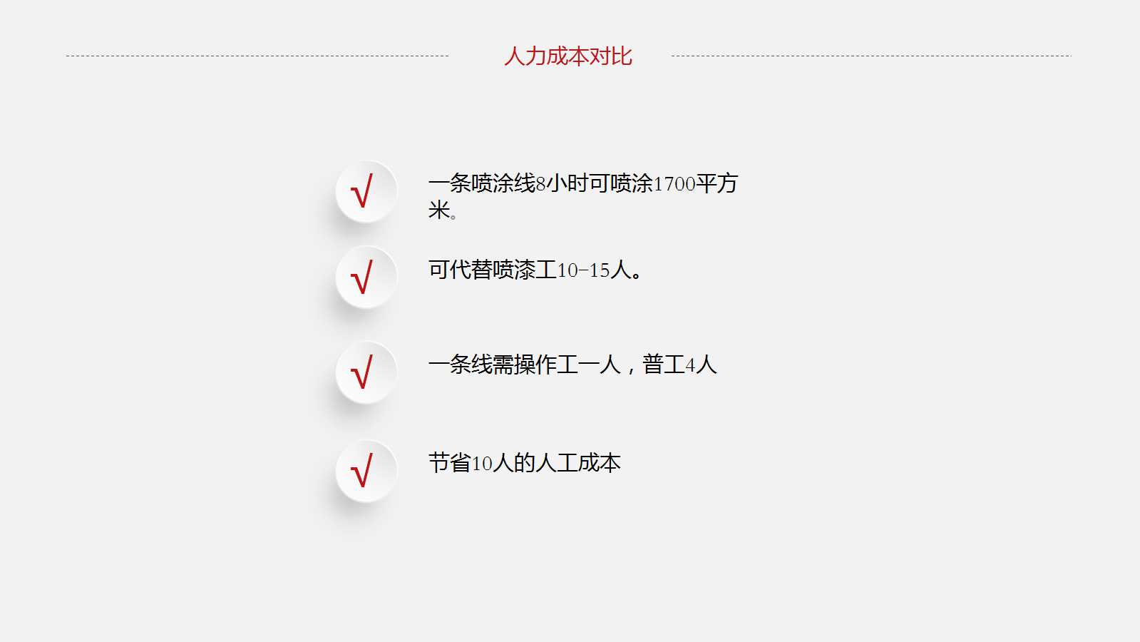 人力成本对比。一条喷涂线8小指可喷涂1700平左右,代替了喷漆工10-15人的产量,一条线需要一名操作工,普通工人4人,整体节省10人成本。综合对比,往复式喷涂的优势,生产效率是提高的,在原有的人工和产量上得到了大大地提高,同时提高了产品质量。同时也极大地降低了油漆的成本,降低了人工成本,减少了VOC的排放量。