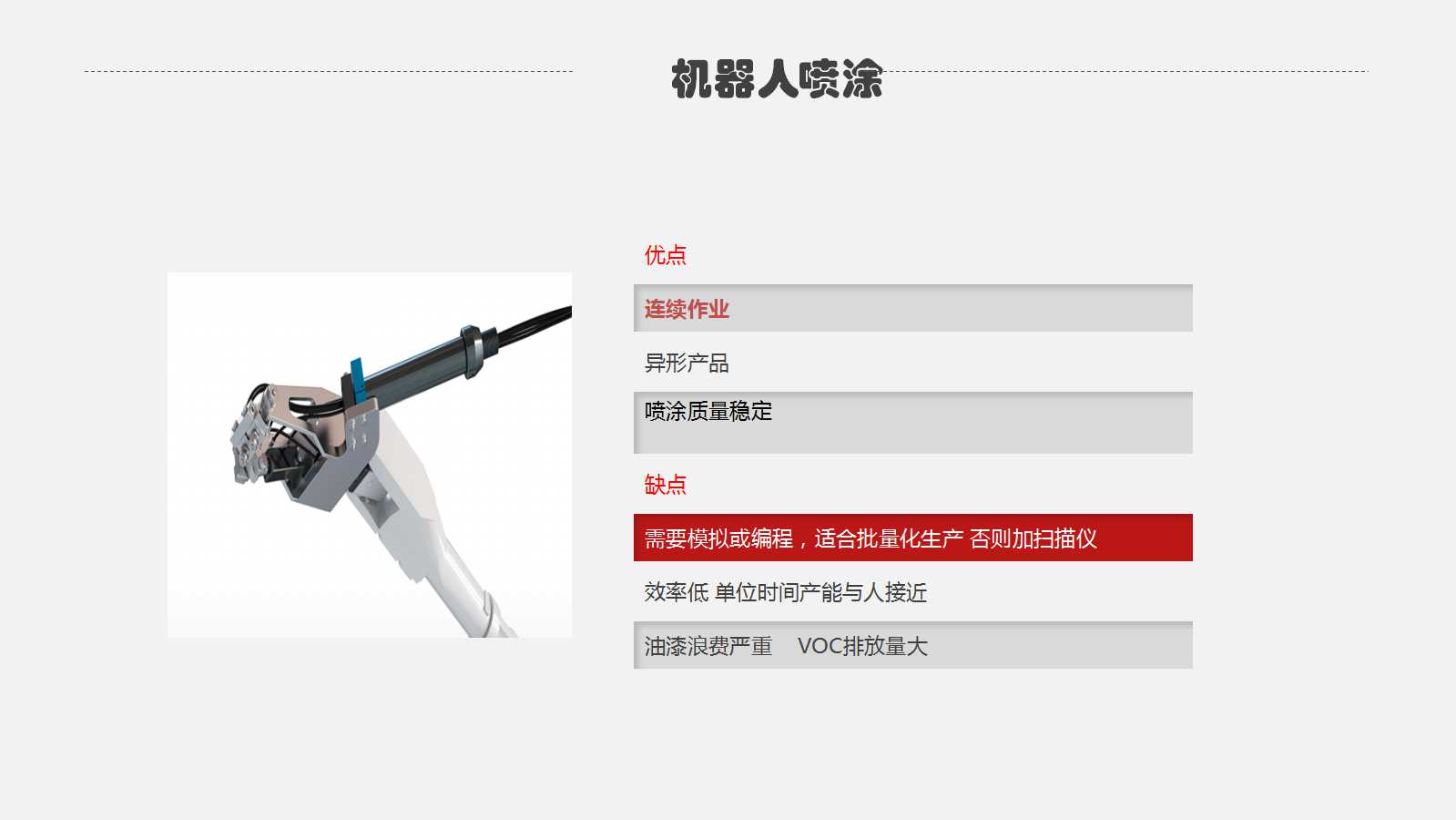 机器人喷涂这是行业一直寄予厚望的一种喷涂方式,但是发展缓慢,优点很突出,设置好喷涂路径和喷涂量,可以实现连续作业。但是如果工件不一样,就会比较麻烦。现在上午3D扫描仪技术成本比较高。同时机器人的效率也不是很高,和一个人差不多,油漆利用率低,VOC排放量较大。