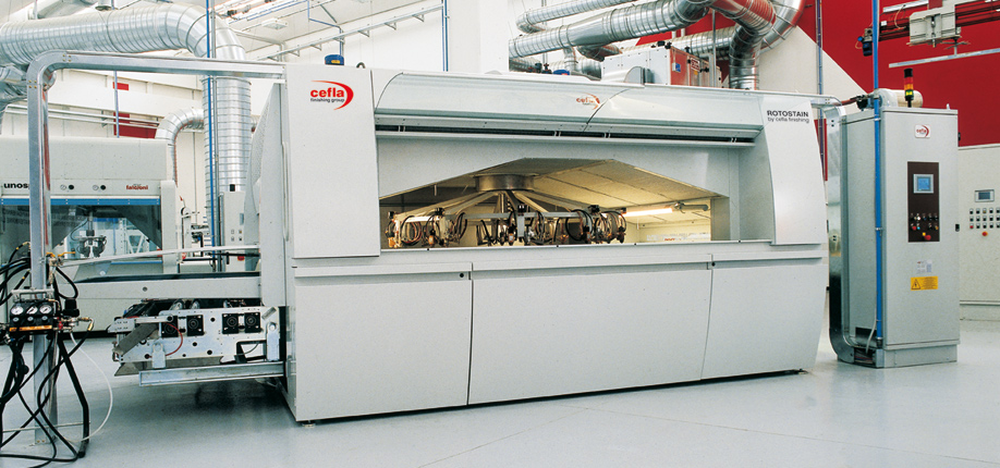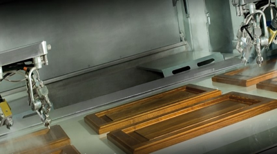 流水线机械喷涂比较少见,主要是用在旋转喷涂的基材着色,可以实现集材的着色,效果和均匀度要超过手工喷涂,后续的其他的工艺可能还要在底漆之后、面漆之前进行人工的修色,弥补基材色差,但单纯的讲基材着色,是优于人工的。