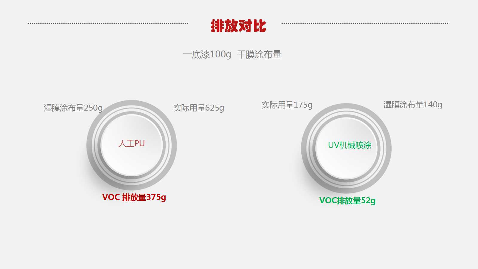 排放对比。达到100g的干膜涂布量,传统手工喷PU漆,湿膜涂量250克,实际用量达625克,VOC排放量375克,油漆利用率40%。UV往复式喷涂,湿膜涂量140克,实际用量达625克,VOC排放量52克,VOC排放减少七倍,大大降低了相应的VOC的投入设备和运行成本。