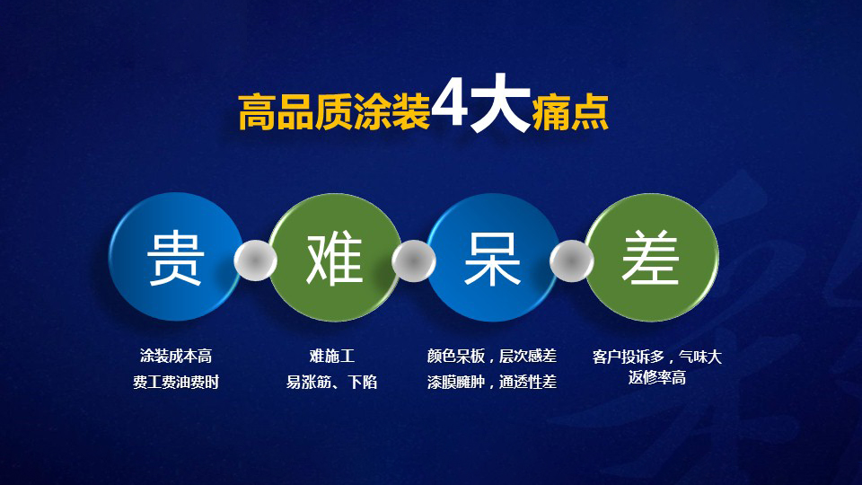 高品质的涂装的痛点。企业共同要解决的痛点有四个方面:一是涂装成本高、费工费油费时;二是难施工、易涨筋、易下陷;三是颜色呆板、层次感差、漆膜臃肿、通透性差;四是客户投诉多、气味大、返修率高。
