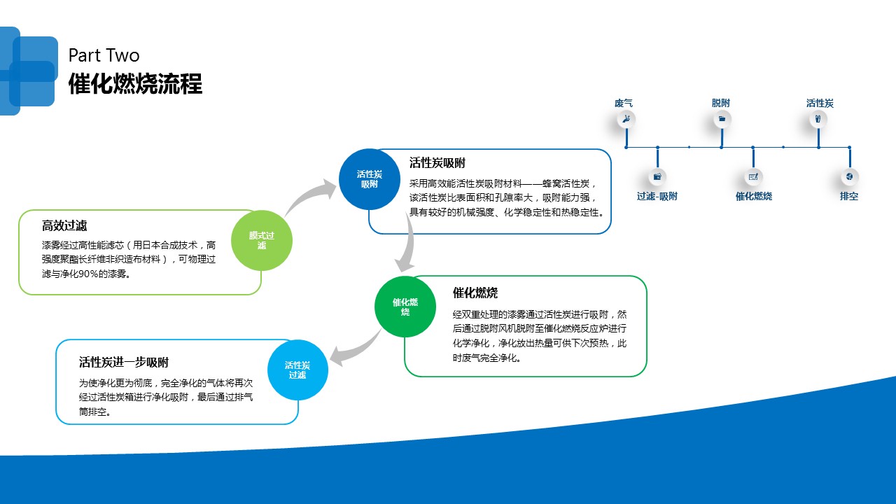在喷漆车间产生的喷漆废气首先通过喷漆房内设施(水帘,无泵,喷台等)一次过滤后剩余废气通过喷漆废气集气口进入油漆废气催化燃烧设备进行多重过滤,吸附,脱附,反应等流程后,生成无害气体排入大气,该过程可实时监测数据,净化效率可达95%。