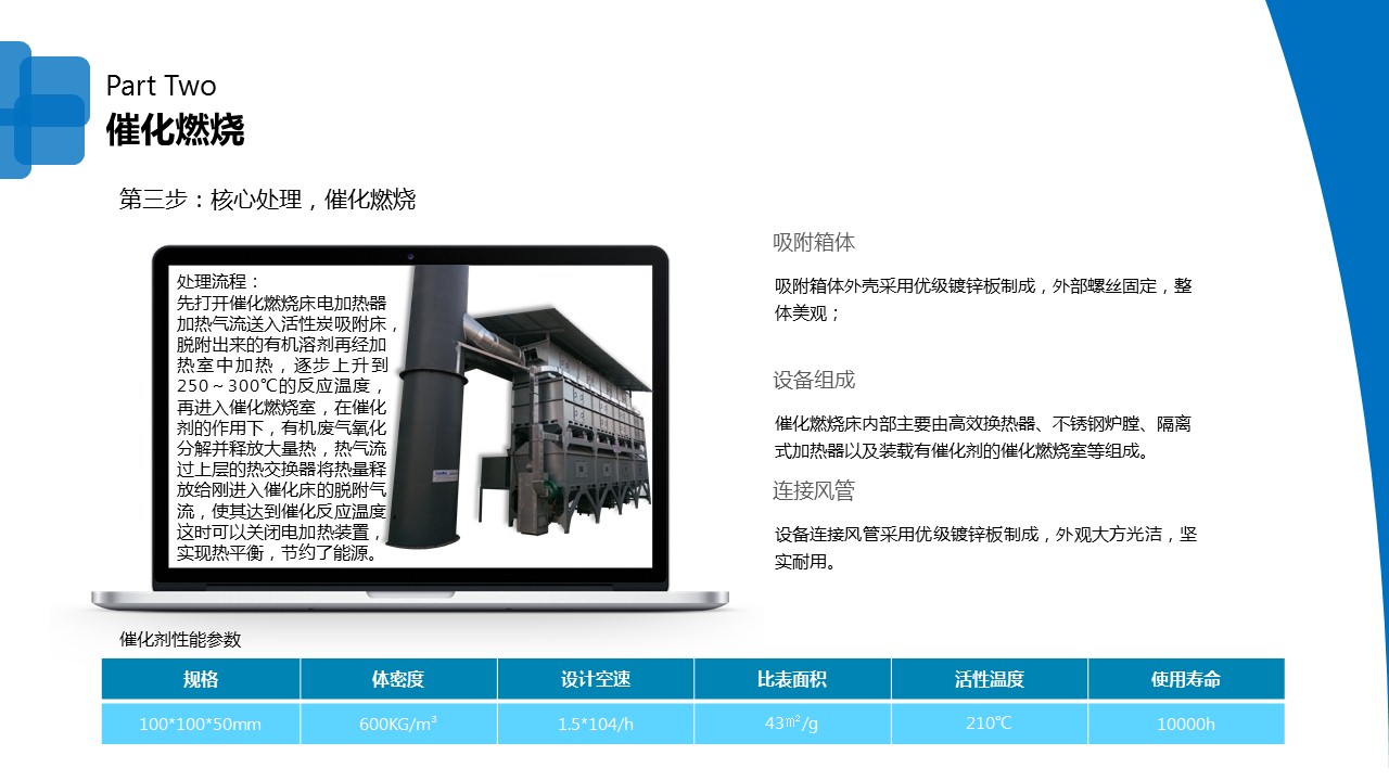 ①净化率高,无二次污染。处理效率高,无二次污染,用催化燃烧法处理有机废气的净化率一般都在95%以上,最终产物为无害的CO2和H20,因为无二次污染问题,此外,由于温度低,能大量减少NOx的生成。