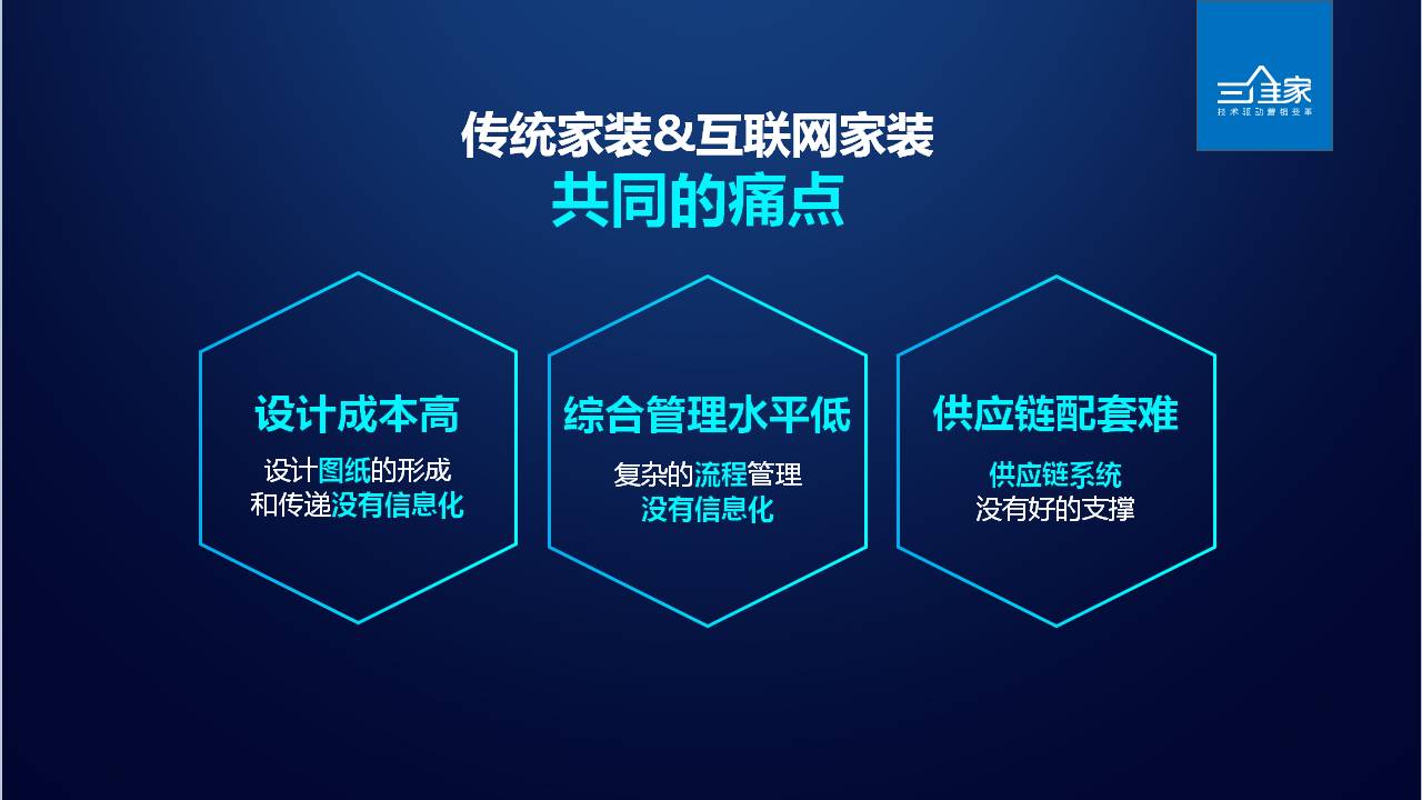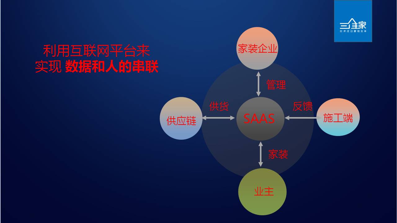互联网家装和传统家装的共同的痛点。第一是设计成本高,设计图纸的形成和传递没有信息化。第二是供应链配套难,供应链系统没有好的支撑。第三是综合管理水平低,复杂的流程管理没有信息化,在过程中造成浪费。要解决整个的问题,必须通过人和信息化进行综合解决。首先把订单和信息化打通,通过软件生成作业指令,配合互联网协同作业。最终的目标是订单和客户,要通过一系列的数据去为客户服务,通过SAAS技术把业主、家装企业、施工端和工厂结合在一起。工业化设计、施工调配系统和供应链IT系统是互联网技术未来发挥的价值所在。