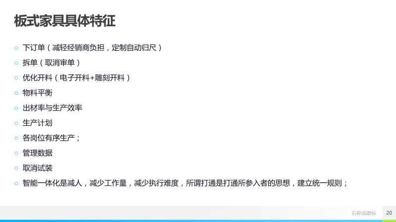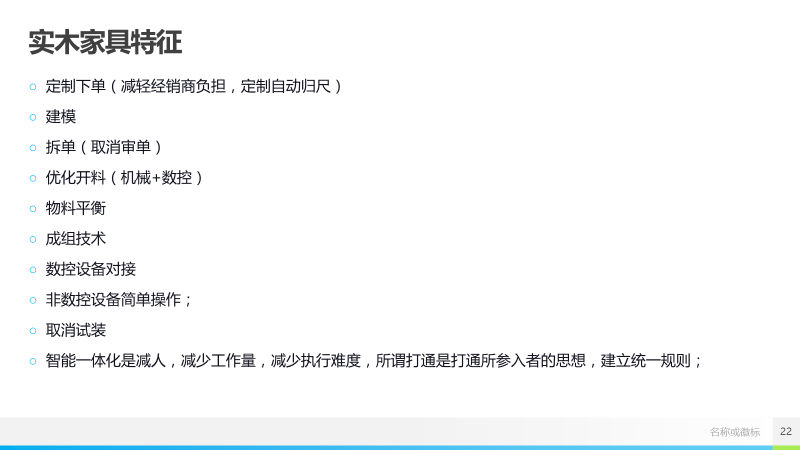 板式家具的智能生产。第一,板式家具在定制的时候,一定要考虑为经销商减少负担。第二,现在很多软件都能拆单,但拆单以后应该有一个自动的归档功能,利用成组技术,实现批量化生产。第三,板式家具要避免试装。试装只能把产品搞坏以外,必须通过智能化和信息化实现尺寸零误差,实现一次性精准组装。总而言之,智能化生产要减人、减工作量、减执行难度,打通所有参与者的思想,才能最终达到智能生产。