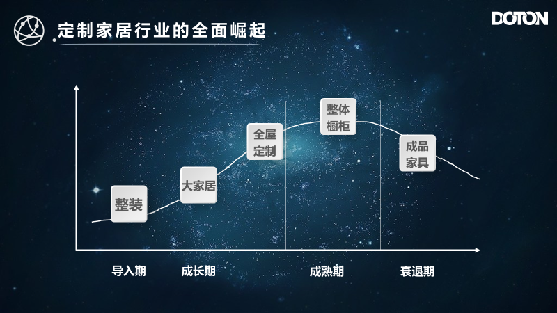 如果把一个产品的生命周期划分为4个周期,目前成品家具可能已经过了成熟期。全屋定制属于蓬勃发展,已经进入成熟期。紧接着是大家居,还有正在开始发力的整装。这其实也是家居整个行业的生命周期的体现。