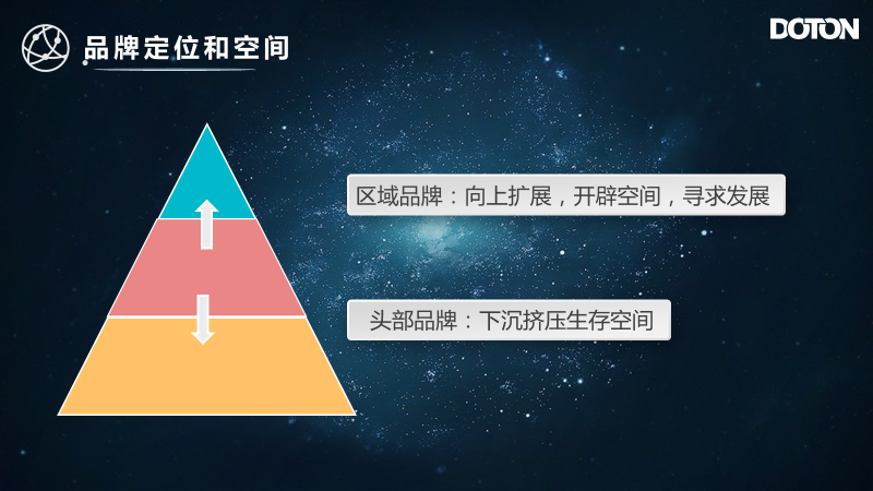 品牌如何定位、如何发展。如果把市场和行业看成一个金字塔,那么头部品牌下沉挤压生存空间。区域品牌只能向上扩展,开辟空间,寻求发展。区域品牌寻求发展,要寻求差异化,一定要打造品牌属性,跳出红海,找到自己的蓝海。