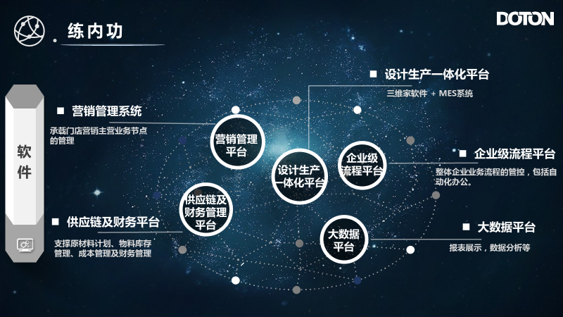 练内功。第一是软件系统,即企业的信息化系统。一个企业要想打通前后端,必须要打造自己的信息化平台,从前端的营销管理,到后端的设计生产,中间的企业流程、审批、OA、供应链和财务等等都需要大数据进行管理。