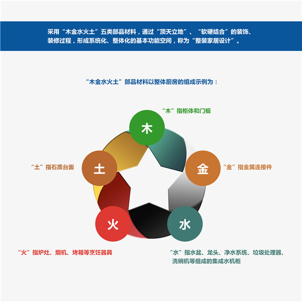 “木金水火土”部品材料以整体厨房的组成示例为:“木”指柜体和门板,“金”指金属连接件,“水”指水盆、龙头、净水系统、垃圾处理器、洗碗机等组成的集成水机柜,“火”指炉灶、烟机、烤箱等烹饪器具,“土”指石质台面。
