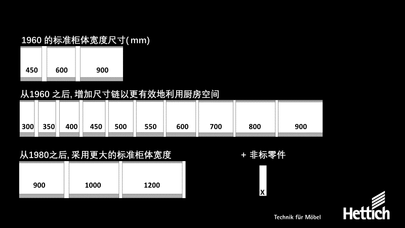 这张图是厨房家具标准柜体宽度的尺寸发展史。60年代的时候一共有三个标准柜体宽度尺寸: