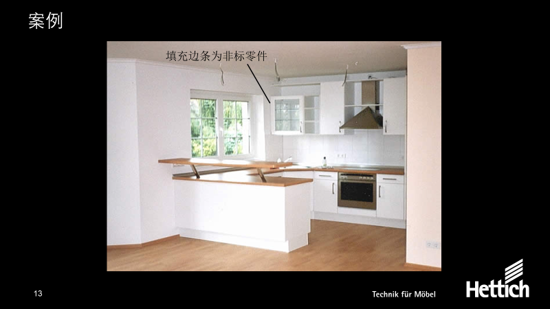 案例1:一个半开放式的厨房。这是做好以后的效果,这上面就一个非标零件——吊柜墙边的封条,其他全是标准化的柜体。