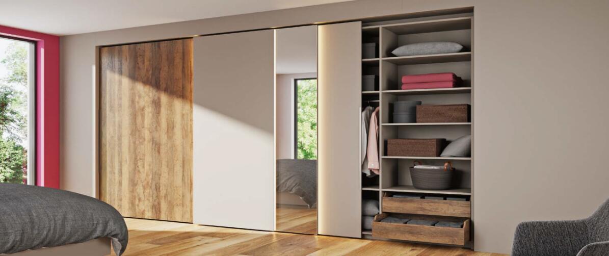 案例2:大衣柜。材料选择可为实木或人造板,由于标准尺寸的限制,需要设计最上面的挡板才能做到天花板无缝的效果,所以海蒂诗选择最上面的挡板做了抽屉的设计,因为抽屉是生产的标准件之一,这样既满足了收纳需求,又只需要改变抽屉面板的尺寸就可以完全满足个性化定制。而如果把整个柜子都变成非标准化,柜子的生产成本会非常高,所以定制用标准化的手段去实现是完全可以的。