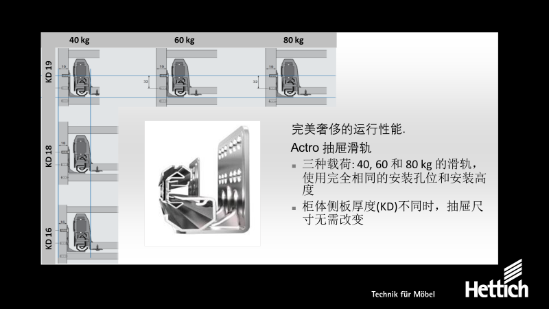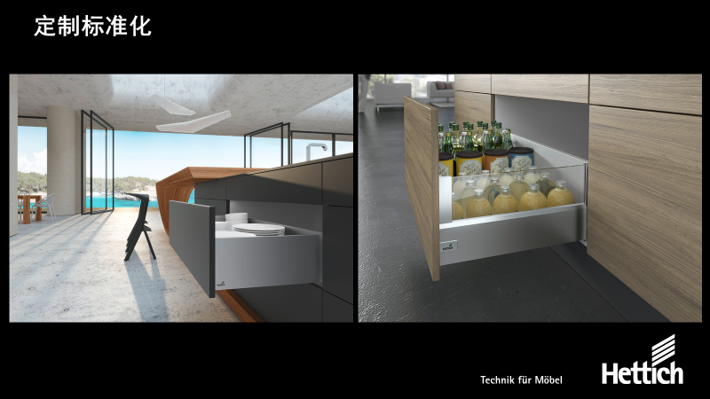 案例10:Actro抽屉滑轨系统。Actro滑轨系统有两个优点:一是产品系统所有辅助配件的安装孔位都一样,加高围栏和侧板的孔位是相同的;二是抽屉系统用到了不同承重(40kg、60kg和80kg)的滑轨,但是安装的孔位完全一样,而能做到这一点的企业,全球只有海蒂诗一家(其他企业的抽屉系统均以50公斤为分界设置了两种孔位)。还有一个曜石黑Sensys系列铰链系列,它的特点是涵盖各种厚度门板,最厚可达到19mm。曜石黑Sensys系列是公司在中国生产的一款暗藏式的抽屉滑轨,也是国内做实木家具的企业比较喜欢的一款产品。海蒂诗把类似这种设计叫平台概念,使用这样产品的好处是后端生产不用做任何变动,产品就可以实现差异化,即全屋定制的标准化和五金应用的差异化。
