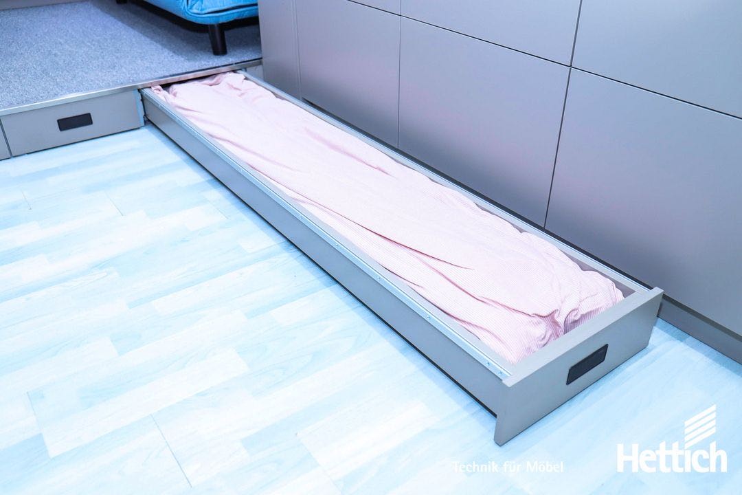 案例5:18平米单身公寓。海蒂诗18平米单身公寓获2020深圳国际家具展金汐奖“最佳全屋解决方案”金奖。单身公寓解决方案,通过在仅有的18㎡空间内,突破空间限制,实现完整的餐厨、客卧、卫浴等极小空间下的生活场景应用,使消费者享受创新解决方案带来的舒适体验,开启意想不到的存储空间,在功能上实现空间利用率的最大化。图1中的厨房是可以进行拉伸的,使用的五金件依旧是移门配件,同样的配件起到了差异化的作用。图2是床底下的深2米的抽屉设计,方便了沙发上的铺盖和被褥的存放。国内做榻榻米收纳空间都是翻盖的,使用的时候非常麻烦,所以设计应该往人性化方向(抽屉)去思考。