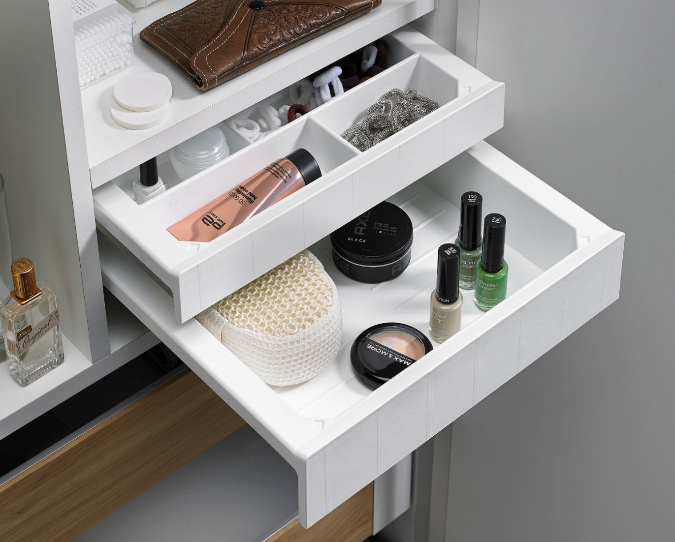 案例6:简单的小抽屉。这个抽屉是由海蒂诗提供的办公用配件:Smartray,有塑料和钢质的两种。这个原用在办公领域的抽屉使用在化妆间化妆柜上,可以分类各种化妆用品,小空间实现分类可以提高效率和收纳的便利程度。五金配件没变,但是方案完全不同,这也是五金的差异化应用。