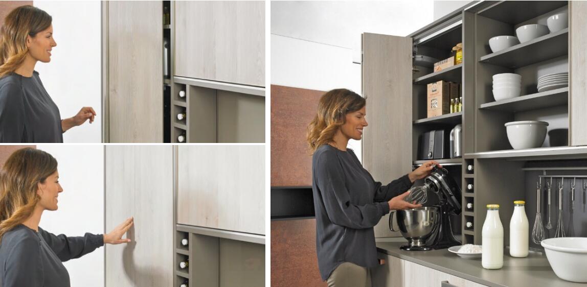案例9:移门和折门。这是一套厨房家具的台面柜,柜门按弹式打开,打开以后是右侧的方案。而折门全打开以后,人在台面上移动不会和折门发生冲突,整个做饭的过程中折门只需开关一次,避免了每次拿东西开关一次的繁琐。这种设计非常便利,而且打开的空间比较宽,占据的空间又比较小,这就是这类产品研发和设计时候的切入点。