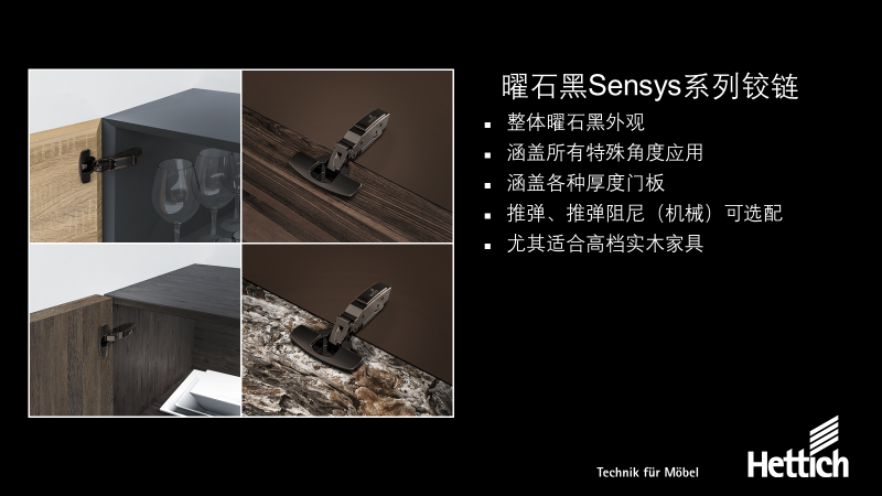 为了适应这三种变化,海蒂诗在不断开发新的产品:适应超薄材质、特殊玻璃材质的五金,无拉手的五金等。希望小五金能够为家具企业的创新发挥大的作用,提升更多的附加值。