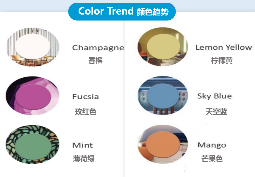 颜色趋势。经公司调研发现,图1中的6个颜色是全球的主流色彩。虽然红色和灰色在中国是非常常见的两总颜色,但是如果综合全球的色彩趋势来看,它们并不占据主导地位,而我们所总结的所有色彩信息,是以全球环境背景下为引导而做出来的。