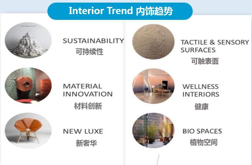 内饰趋势。图2中的6种内饰装饰趋势是目前全球使用最多的方案,目前从中国来看,更加关注的是轻奢以及可触表面这两个概念。