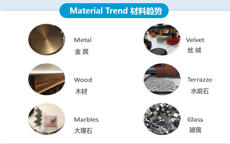 材料趋势。图3中所显示出的材料也是全球所使用的6个比较重要的材料。对于家具行业来讲,木材是家具业使用最多的材料。但是我们也观察到一个有趣的现象,在中国水磨石的地位日渐提升,并且它的应用面也是逐渐地在拓展。而提到木材花色与纹理,与世界上其他地区(比如欧洲)的主流市场来比,中国市场的接受度还是稍微偏向于平滑、顺畅的纹理。