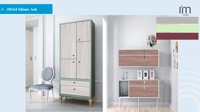 Shimo。这是一款曲柳设计。水曲柳在中国并不是主流树种,但是它本身的木材纹理比较平滑、顺畅。对这款设计来讲,它有非常优雅的线条,没有很大的疤和结,所以我们就把在日本受到的灵感和启发进行的设计引进到中国。从颜色上来讲,它的主要的颜色搭配是灰色,再配上薄荷绿和灰度比较重的紫色或红色。