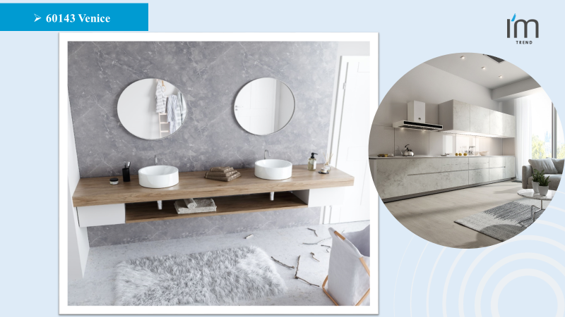 Venice。这是一款大理石设计,它的设计花色来源于威尼斯,纹理上比较明显的裂缝和黑点是模仿威尼斯小镇巷道的感觉,而这款大理石设计也从经典的灰白黑三个色系演变成了如棕色、紫铜色等颜色。