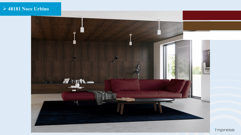 Noce Urbino。第一款设计是“城市之夜”,从名字中何以看出它是想模仿黑夜的魅力,即作为背板的胡桃木设计。这种设计可以大面积的使用,即使有这样的山纹也不会显得非常杂乱,反而给人一种高档、大气的感觉。在颜色搭配上面,建议与效果图上一样采用白色、米色、棕色,包括中国人偏爱的猩红色等。
