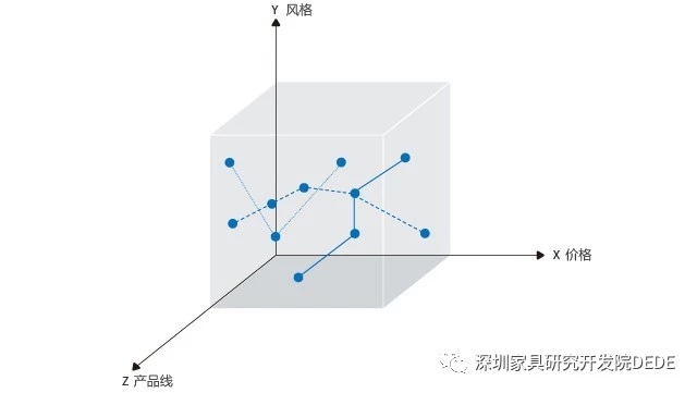 既然是三维空间,那么就需要三个坐标轴来标定,就家居行业而言,我们以价格带、产品线的宽窄和风格带作为三个坐标轴,这样所有类型的企业都是丢得进来的。