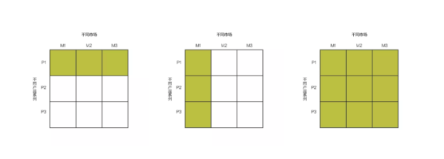 具体分布有很多做法,比如以一个系列P1的产品占据一片市场M1,这叫做聚焦战略;也可以是P1--M1、M2、M3...这是指一个系列的产品占据不同的市场,强化市场拓展;还可以是P1、P2、P3--M1,即用不同系列的产品进攻同一个市场,强化渗透;或者P1、P2、P3--M1、M2、M3,即市场全覆盖,不同的企业或同一家企业的不同阶段,则策略也可能不一样。