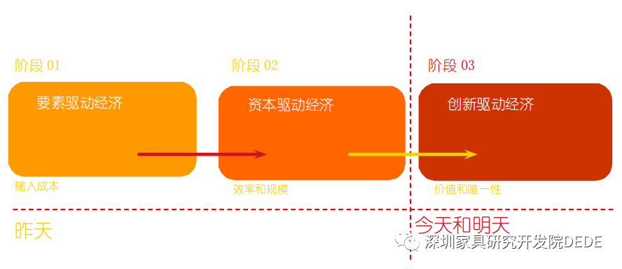 在要素驱动经济中,主要是谋其成本优势,但成本会有极限。同时,在当代中国家具行业中,由于一直没有定型,一直处于不确定的发展状态中,所以要素一直在变。如:从材料更迭到表面装饰手法,从品质控制到工业化生产,从造型设计到风格流变,从活动家具到定制系统家具等都是这么变过来的。改革开放四十年来,经历了一波又一波的时代大潮,在每一个所谓的“风口”下,都会有一批企业脱颖而出,而在上一个“风口”的多数弄潮儿则惨遭淘汰,形成各领风骚数年的独特景象。